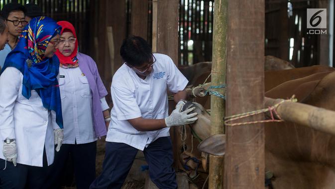 Petugas Dinas Ketahanan Pangan, Kelautan, dan Pertanian DKI Jakarta memeriksa gigi dan mulut sapi di Pondok Kelapa, Jakarta, Rabu (8/8). Pemeriksaan untuk menjamin kelayakan dan kesehatan medis hewan kurban untuk dikonsumsi. (Merdeka.com/Imam Buhori)