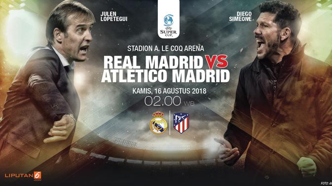 Bola.com, Jakarta - Real Madrid bersua Atletico Madrid pada pentas Piala Super Eropa 2018, di Lilleküla Stadium, Tallinn, Estoni, Rabu (15/8/2018) atau Kamis (16/8/2018) dini hari WIB. Ketiadaan Cristiano Ronaldo menjadi atensi utama, yang membuat publik berharap akan ada bintang lain yang muncul menjadi penentu.