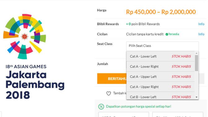 Menurut pantauan Liputan6.com di situs Blibli, Senin (20/8/2019), semua kategori bangku untuk Closing Ceremony Asian Games 2018 sudah tertulis "stok habis".
