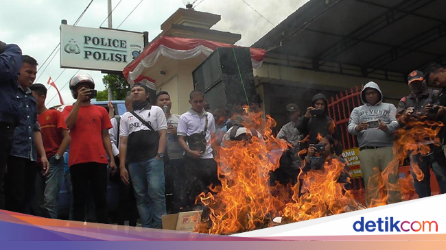 Tidak hanya melakukan orasi di depan Mapolda, massa aksi juga membakar spanduk dan poster menolak aksi deklarasi 2019 ganti presiden yang terdapat gambar Ahmad Dhani dan Neno Warisman.