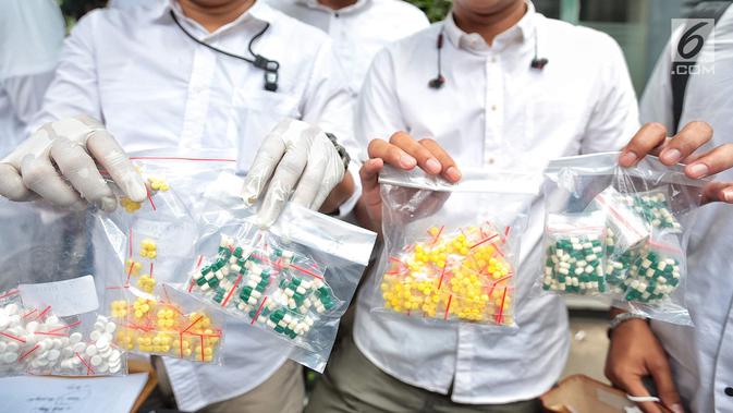 Barang bukti obat- obatan keras saat ungkap kasus di Mapolda Metro Jaya, Jakarta, Selasa (19/9). Polisi menyita 15.367 pil obat daftar G yang tidak terdaftar dari dua lokasi berbeda, yakni Tambora, Jakarta dan Babelan, Bekasi. (Liputan6.com/Faizal Fanani)