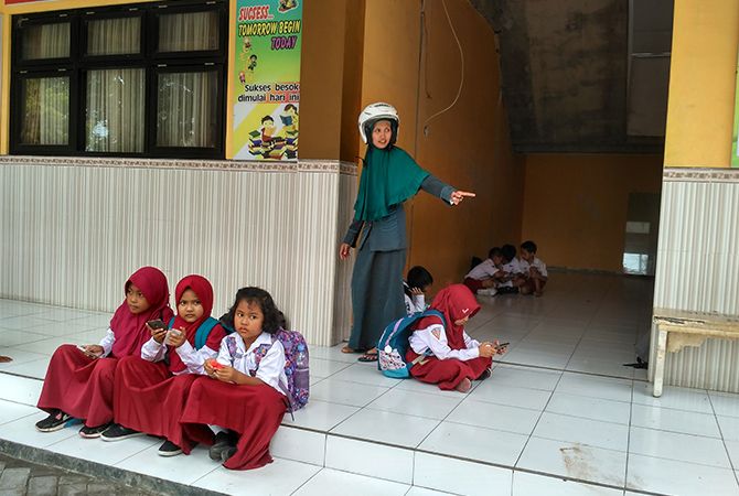 BERISTIRAHAT: Sejumlah siswa SDN 1 Kemayoran, Bangkalan duduk santai di depan kelas. (JUPRI/RadarMadura.id)